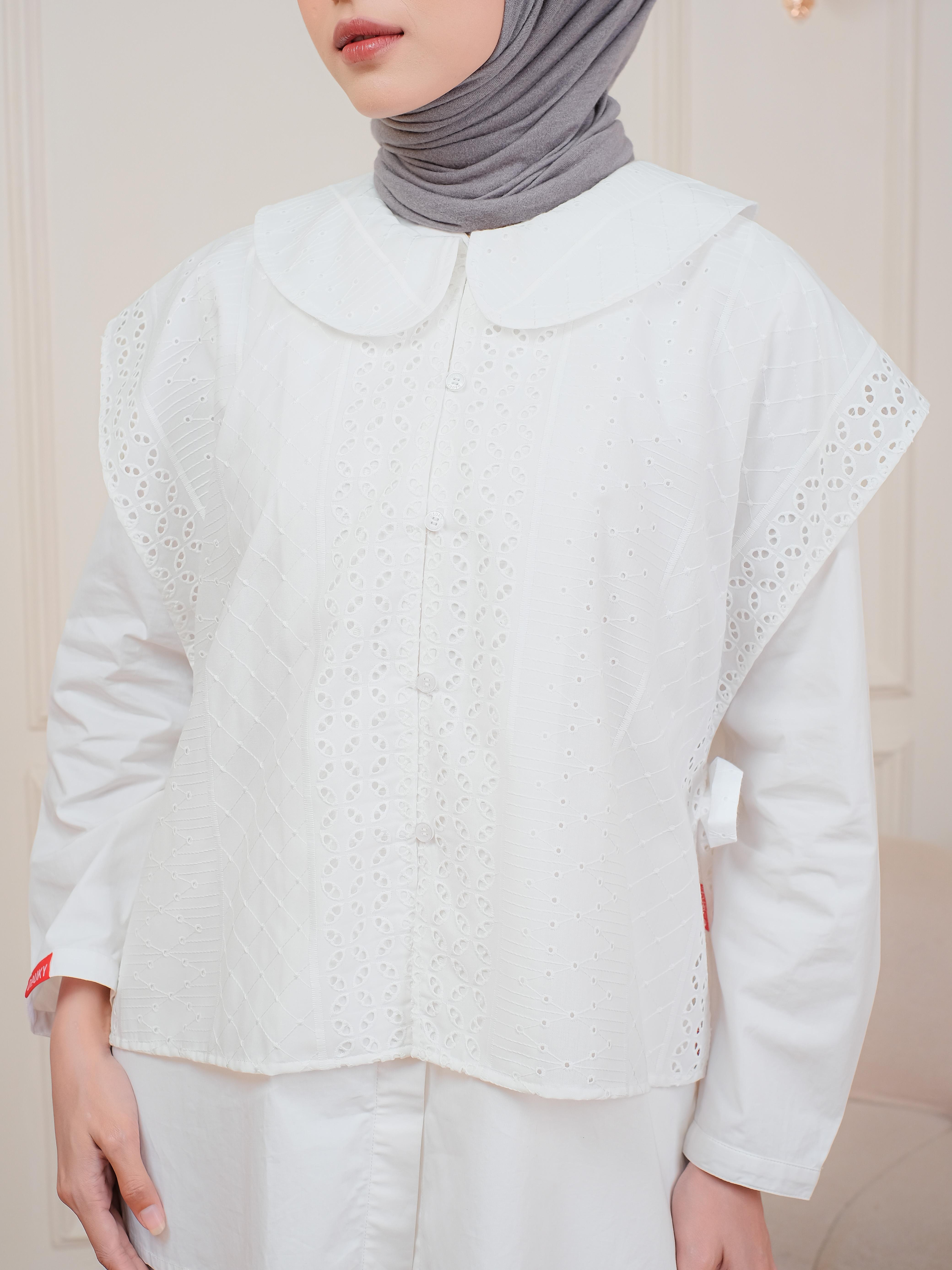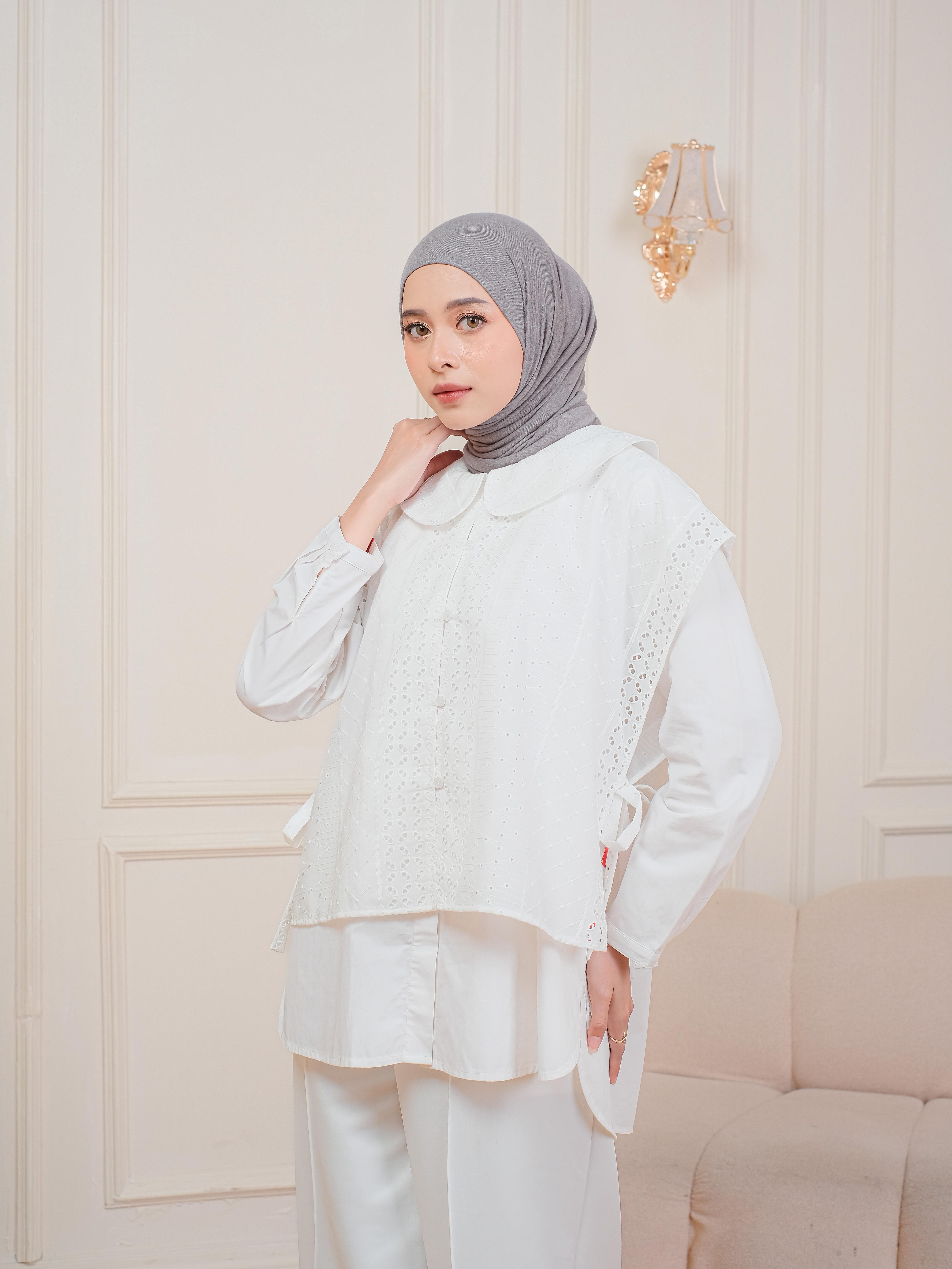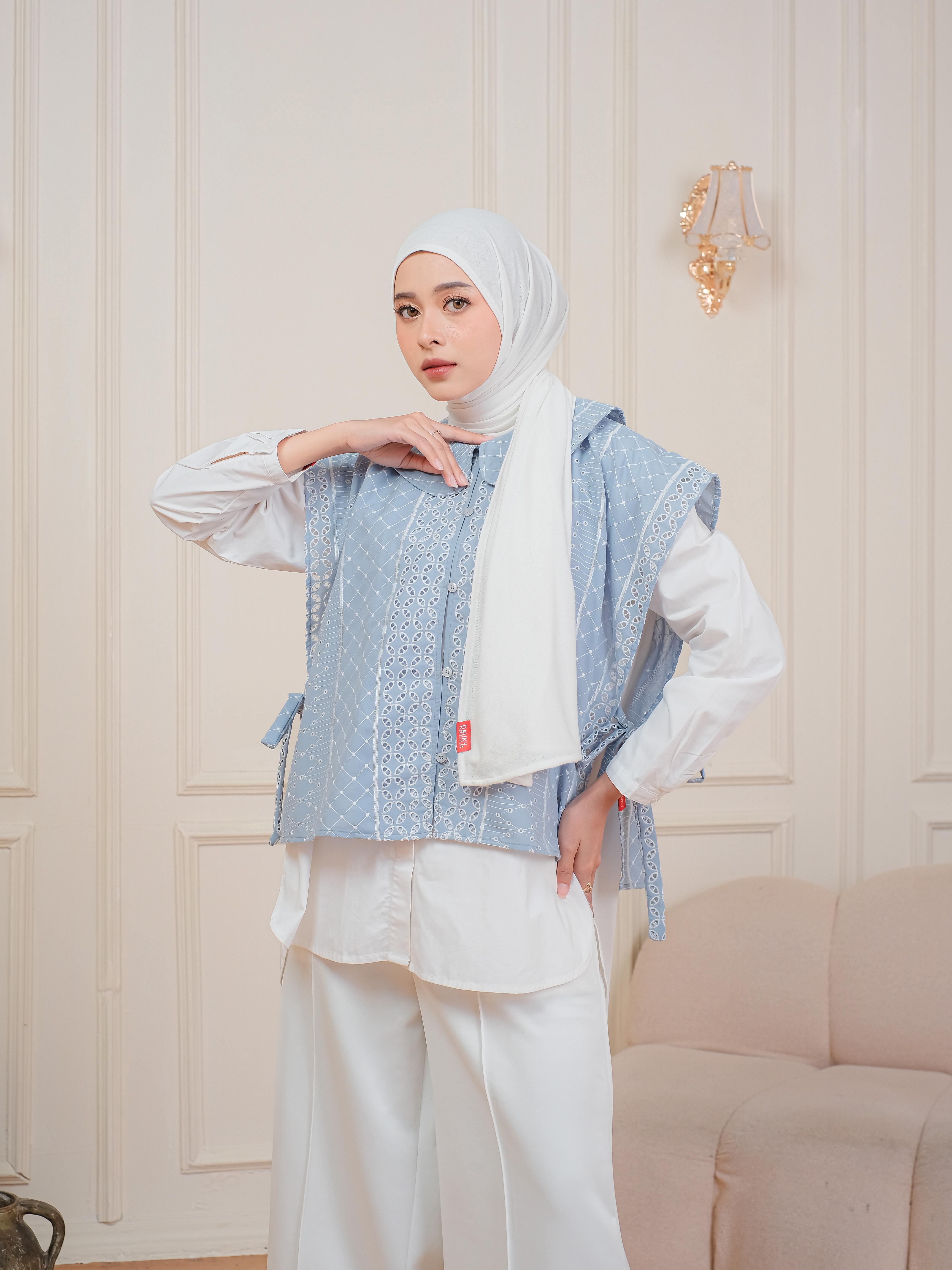 Desain vest untuk dengan penambahan detail tali di setiap sisi menjadikan bahan katun bordir bermotif folklore ini semakin terlihat estetis. Tampilan depan menyerupai kimono yang juga memberikan kesan elegan dan eksklusif.